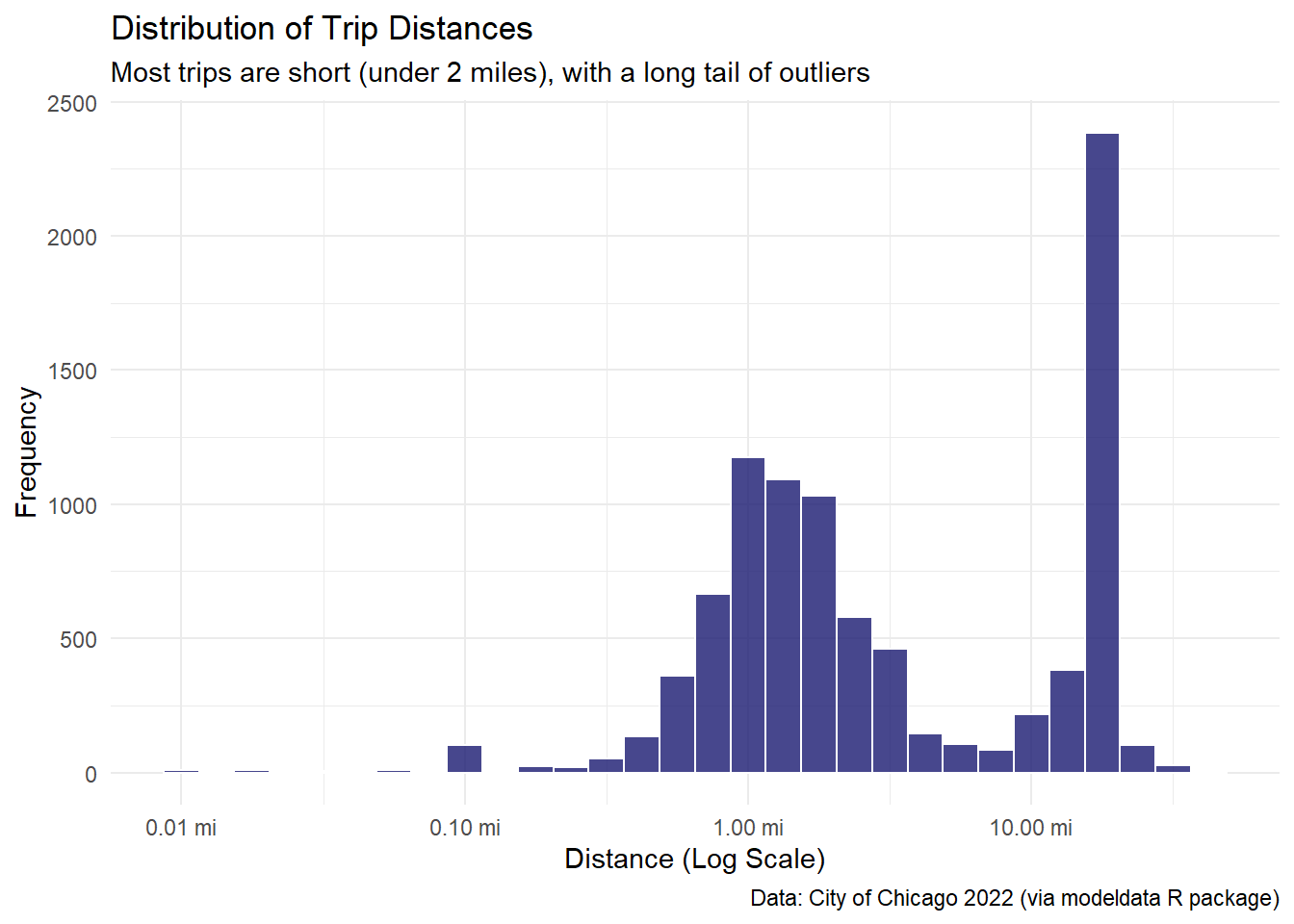 subtitle = "Most trips are short (under 2 miles), with a long tail of outliers",