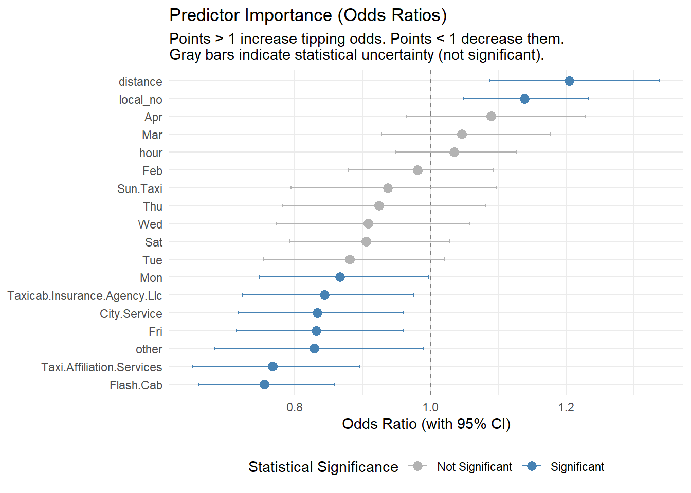 What actually drives tipping? This chart visualizes the Odds Ratios with 95% Confidence Intervals.